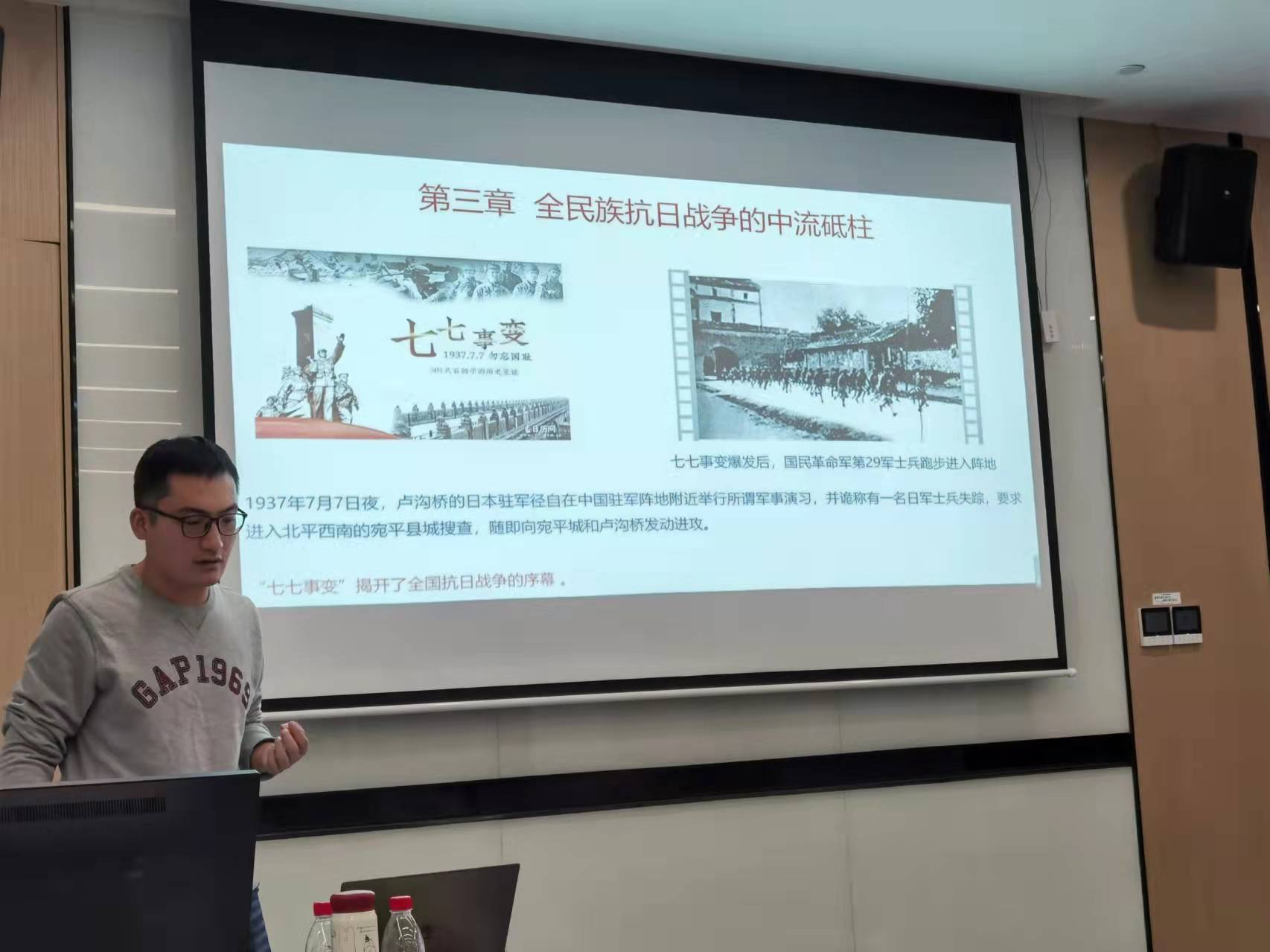 最后,由第一党小组成员进行微党课展示,小组成员准备了《中国共产党简史》第三章节的内容,由朱通主讲。朱老师从“党的全面抗战路线和持久抗战方针的制定”“开展敌后抗日游击战争和坚持统一战线中的独立自主”“坚持抗战、团结、进步的方针”“巩固抗日根据地和推进抗日民主运动”“加强党的建设、推进马克思主义中国化和开展整风运动”“党的七大和确立毛泽东思想为党的指导思想、抗日战争的最后胜利”六小节内容出发,为党员同志讲解了全民族抗日战争中的中流砥柱,一代代中国共产党人英勇奋战在抗日战争的最前线,支撑起中华民族救亡图存的希望和决心。