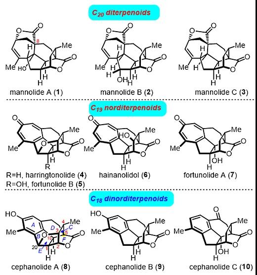 多环二萜作为一个结构多样的天然产物大家族,为药物研发和先导化合物的发现提供了丰富的来源。三尖杉属二萜(图1,1−10)因其独特的结构和潜在的生理活性而受到化学家与生物学家的广泛关注。Cephanolides A−C(8−10)是由岳建民课题组从粗榧(Cephalotaxus sinensis)中分离出的含有芳香苯环(A环)的C18降二萜(J. Nat. Prod., 2017, 80, 3159–3166),并提出了这一家族天然产物可能的生源合成路径:由GGPP经过多烯环化产生C20的cephalotane骨架(三尖杉属C20二萜,1−3);C19降二萜(4−7)是C20二萜经过脱羧及A环芳构化而来;C18降二萜(8−10)则是由C19降二萜进一步缩环/降解/芳构化等步骤产生。