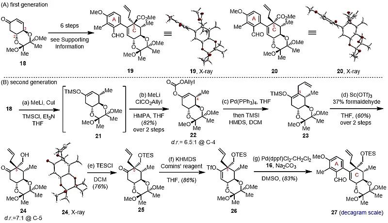 针对含有六个连续手性中心C环的选择性构建问题,作者发展了两代合成路线(图3)。从前手性化合物18出发,通过选择性Michael加成,脱羧烯丙基化、Lewis酸介导的aldol等反应得到含有四个连续手性中心的化合物24。并与A环片段发生Suzuki−Miyaura偶联反应得到化合物27