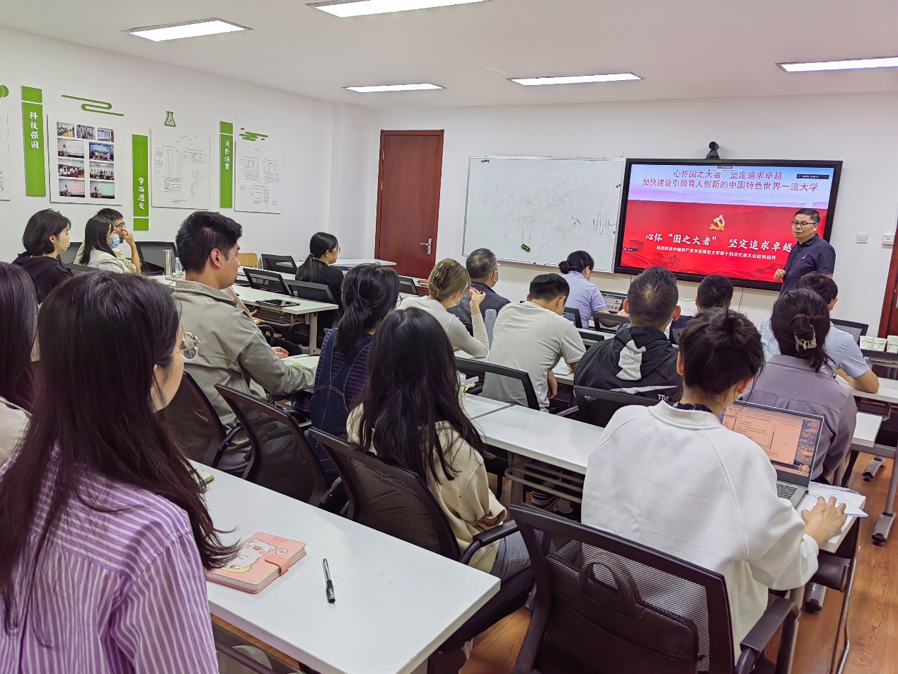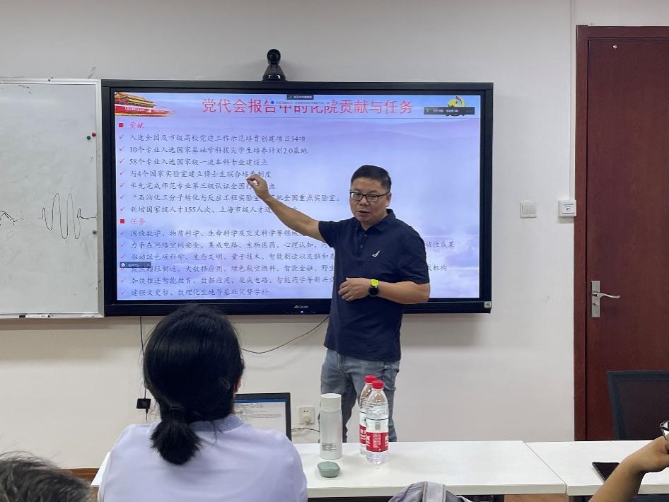 为了深入学习贯彻校第十四次党代会精神,2023年10月7日上午,公司党委在闵行校区化学楼126教室召开党委理论学习中心组(扩大)学习会暨党支部书记例会,就公司第十四次党代会精神进行专题宣讲。公司党委委员、党支部书记、专职组织员和辅导员参加会议,公司党委书记鲜跃仲主持会议。