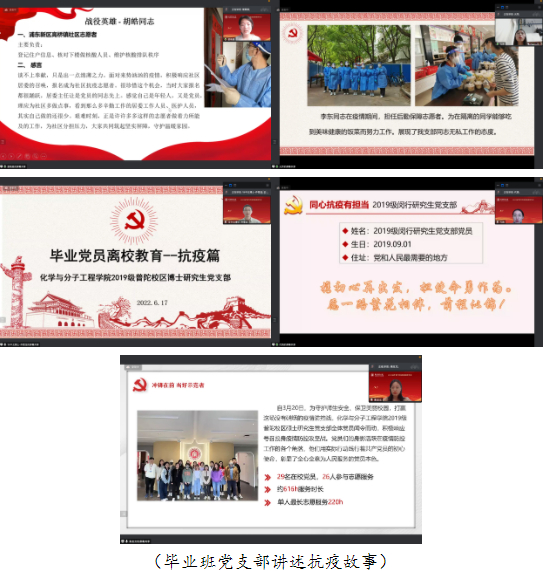 毕业生党员的集体组织生活在国歌声中拉开帷幕,毕业班5位党支部书记围绕“同心守‘沪’、化‘疫’为机”动情地讲述了党员同志们在防疫一线冲锋在前、共克时艰的战“疫”故事。普陀校区高年级研究生党支部书记楚萌恩介绍了支部毕业生党员担任社区志愿者、宿舍志愿者等的经历,感谢支部党员在疫情防控过程中的勇于担当。闵行校区高年级研究生党支部书记袁芳介绍了支部毕业生党员在校园抗疫中的积极表现,他们积极响应公司号召,参与到公共区域消杀、后勤保障、秩序维护等工作中。普陀校区2019级博士研究生党支部书记乔雪龙介绍了支部内8位毕业生党员在疫情防控中的表现,他们中有的担任片区志愿者组长,也有同时担任巡逻、核酸检测、楼宇服务等志愿活动的党员,在抗疫一线,每位党员都全力以赴、无私奉献。闵行校区2019级研究生党支部书记代鸽从物资打包、分发餐食、环境消杀、核酸检测、物资分发等工作模块出发,介绍了本支部毕业生党员在疫情防控期间的优秀表现。普陀校区2019级硕士研究生党支部书记高志文介绍了支部毕业生党员参与校园抗疫的经历和感受,支部党员李银林志愿服务总时长高达220小时,他们用实际行动践行着共产党员的初心使命。