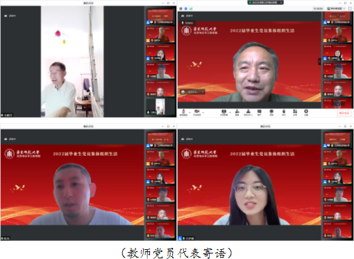 毕业生在校的最后一次集体组织生活,教师党员代表纷纷对即将迈上新征程的党员同学送上了美好祝愿与谆谆叮咛。关工委委员,化学系原总支书记王麟生老师向疫情防控期间参与志愿服务工作的毕业生党员表示高度赞扬,他指出一代人有一代人的命运和责任,每个人都有自己的追求和选择,在人生的道路上,磨难是前进的机遇,幸福是生命的追求,勉励同学们勇敢追梦,努力奋斗。党委委员谢美然老师恰逢自己入党三十五周年,结合自己入党的经历,谢老师寄语毕业生党员,一要不忘初心,坚守理想信念;二要担当责任,尽情发光发热;三要头脑清醒,辨别是非曲直。教工支部书记张亮老师首结合自身工作实际,寄语毕业生党员要努力成为有坚定不移的理想信念、有独立和冷静的思想、有自我革新的精神、有强健的体魄的四“有”青年。教师党员王梦雅老师勉励毕业生党员要坚定不移听党话、跟党走,发扬在华师大养成的良好风范,在青春的赛道上奋力奔跑,努力成长为堪当民族复兴重任的时代新人。
