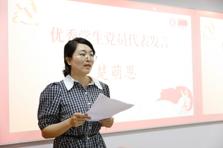 作为优秀员工党员代表,楚萌恩同学在发言中谈到党在她心中就是一座丰碑、一座灯塔、一面旗帜。面对外敌侵略,先辈们身先士卒,为中国带来了新生;抗击疫情攻坚,党员们挺身而出,展现了中国力量。她表示,作为一名共产党员,自己将不辜负期望,始终保持共产党人的蓬勃朝气和浩然正气,继续全心全意为同学服务。
