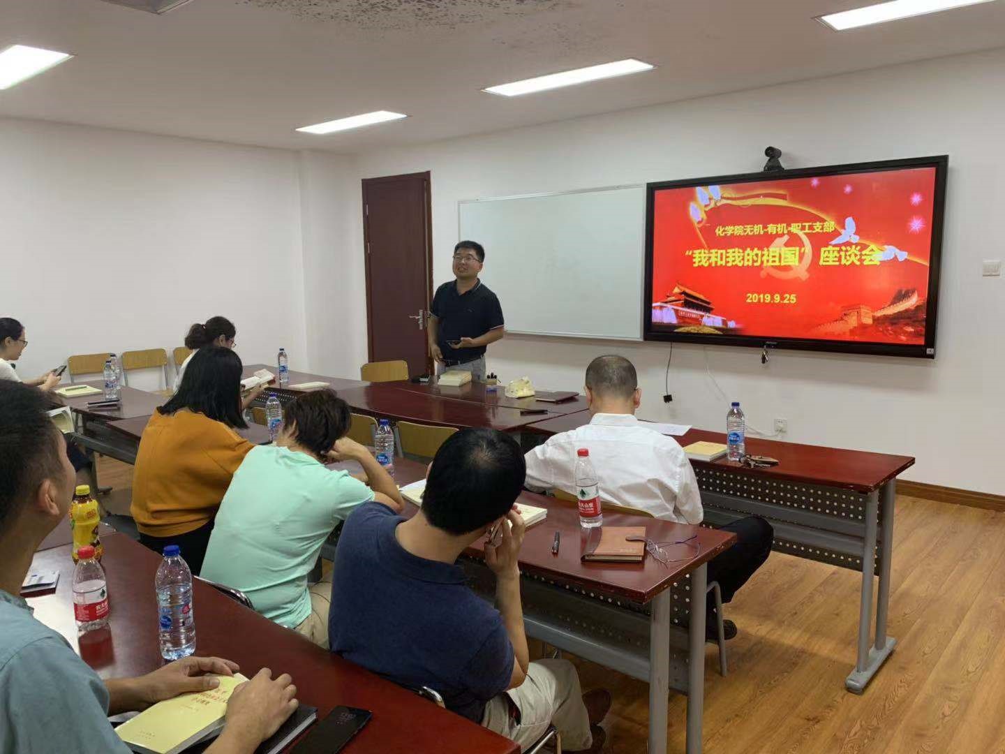 2019年9月25日下午无机-有机-职工联合党支部开展 “不忘初心,牢记使命”主题教育暨“我和我的祖国”专题党日活动。各位党员老师围绕主题纷纷畅谈深刻感悟。老师们从多个方面谈了自己的所见和体会,抒发了对中国共产党和新中国的深厚感情。祖国的飞速发展,尤其是改革开放以来,祖国取得了翻天覆地的历史巨变,更加坚定了跟党走的信念。全体党员纷纷表示要不忘初心,牢记使命,做好自己的本职工作,充分发挥自己优势,为早日实现中华民族伟大复兴的中国梦做出应有贡献。