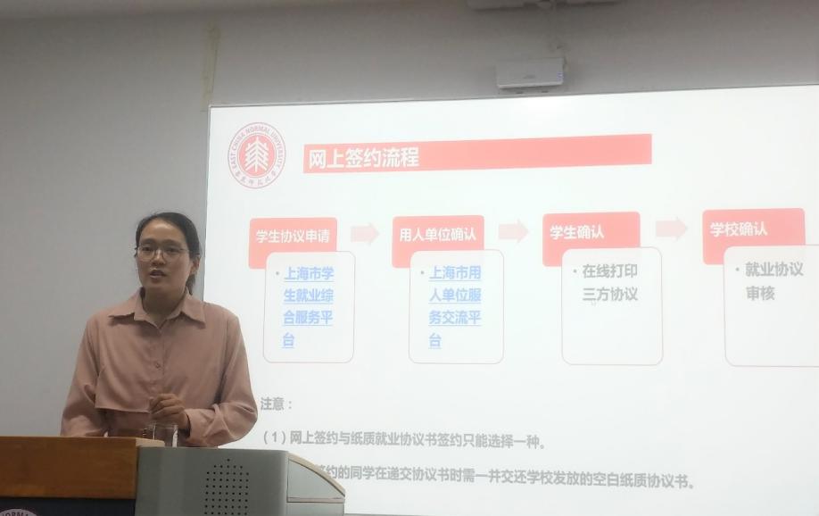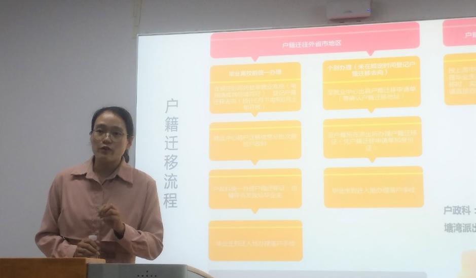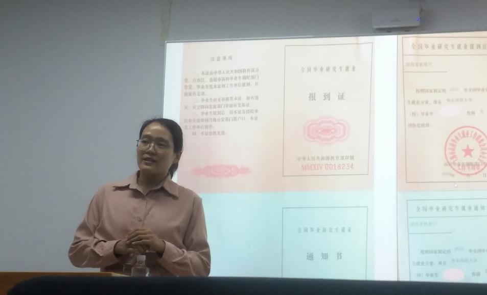 王老师也详细讲解了毕业派遣流程及注意事项。涉及签订就业协议、办理报到证、户籍迁移等方面。王老师强调,签订就业协议前要仔细查看协议内容,包括合同期、试用期、福利、收入等,一旦签署,协议便会生效。另外,王老师也提醒大家,目前签约也可在线上操作完成,但线上签约与书面签约只能选择其中一种。
