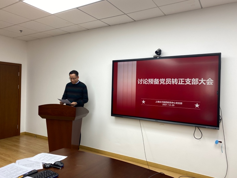 2021年12月29日,上海分子新药研究中心党支部在理科大楼B1602会议室召开支部大会,讨论接收预备党员和预备党员转正事宜。本次党员大会应到会具有表决权的正式党员26人,因事因病请假2人,实到会具有表决权的正式党员24人,有表决权的到会人数超过应到会有表决权人数的半数,符合程序规定。大会由支部书记张亮主持。