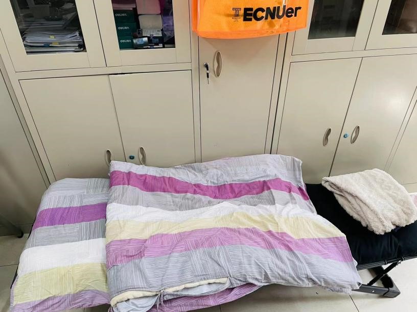 除了通过深夜电台对员工及时进行心理疏导外,她同时还承担着化公司员工核酸检测监督员、做好疫情防控期间闵行化学楼里的师生服务(为封控在宿舍楼里的同学解决燃眉之急)、及时发布公司和闵行区的疫情防控动态、在学工团队的指导下解决疫情防控期间闵行校区的各类员工危机事件等工作。冯老师舍小家为大家,在办公室安个小家。