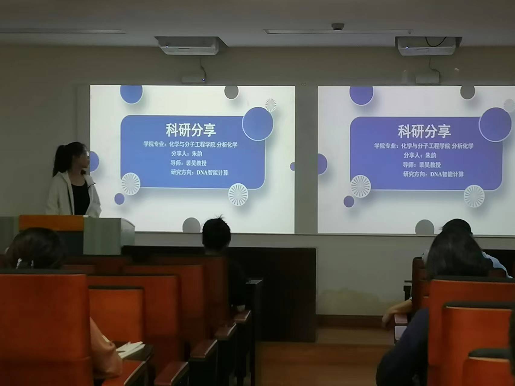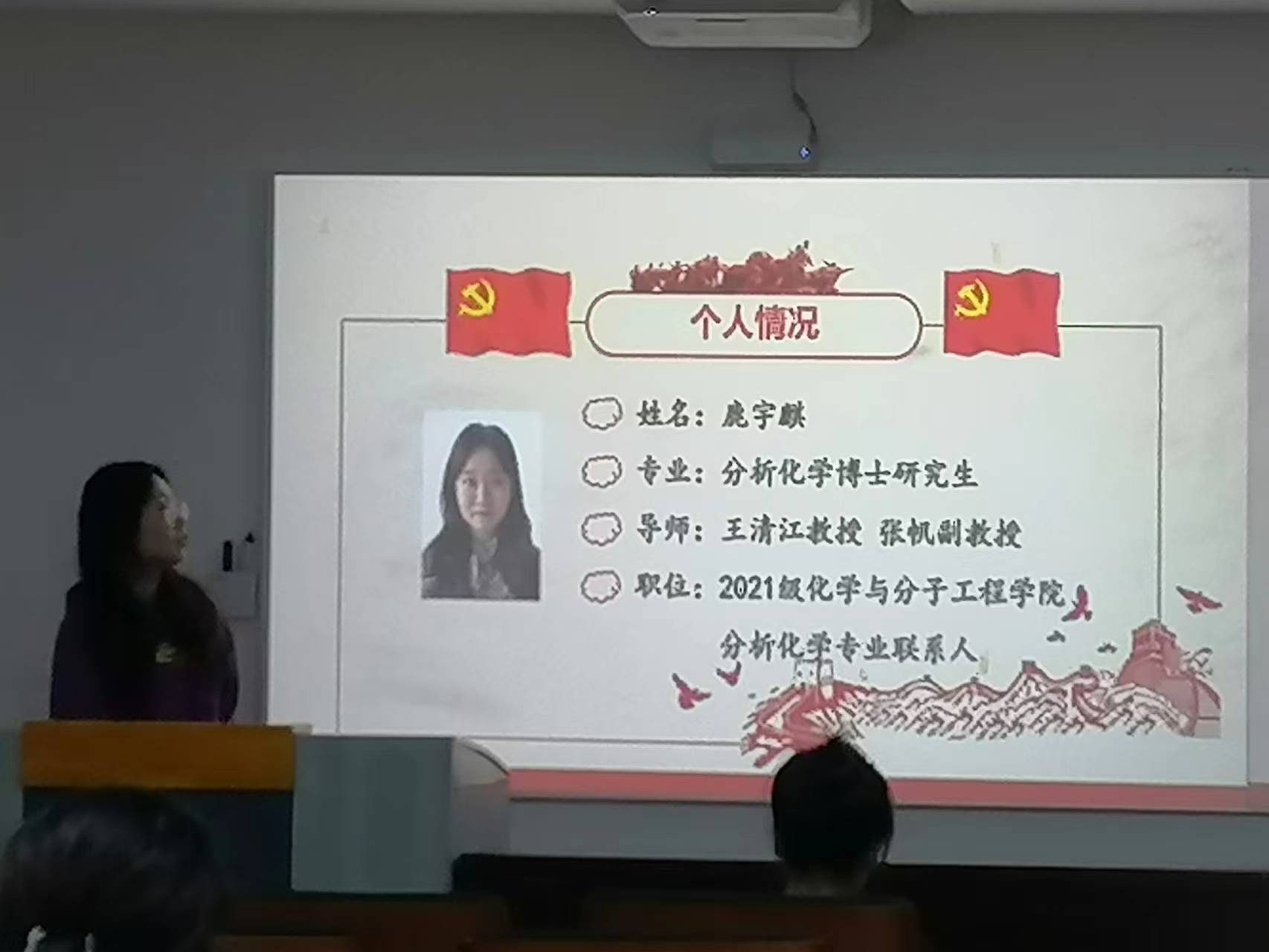 随后,员工支部的党员代表就科研、学习展开了精彩的分享。裴昊老师课题组2021级博士研究生朱韵做了科研分享,展示了研究课题的突破性,科研压力与动力无缝衔接,并透露了“慢就是快”的小秘诀。王清江老师课题组2021级博士研究生鹿宇麒做了员工工作分享。她的硕士与博士都是在公司就读,硕士阶段担任院研会文艺部干事、部长,博士阶段担任2021级分析化学专业联系人。鹿宇麒谈了自己不同的阶段有不同的感悟与精彩,科研工作与自身特长发展兼顾。2021级硕士研究生康琼文谈起科研习惯方面,信念、情绪、效率能量满满,脸上洋溢着阳光与自信。2021级硕士研究生陈文艺从完备组织建设、学术创业并进、丰富文体活动、做好权益服务、工作总结五个维度全面介绍了自己在公司研会工作的日常。优秀的人总有相似,又与众不同!