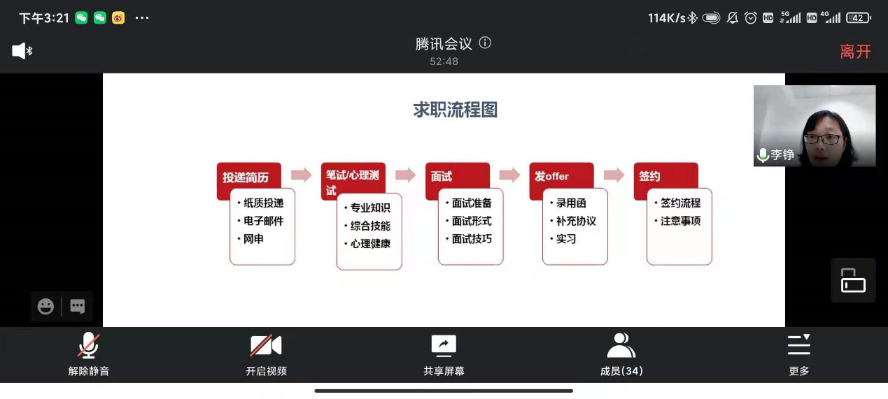 5月19日14:30,3044永利集团于线上开展了一场求职指导与就业政策解读讲座,讲座由校员工发展中心生涯指导主管李铮老师主讲,院毕业班辅导员冯琪老师主持,两校区同学共同聆听。