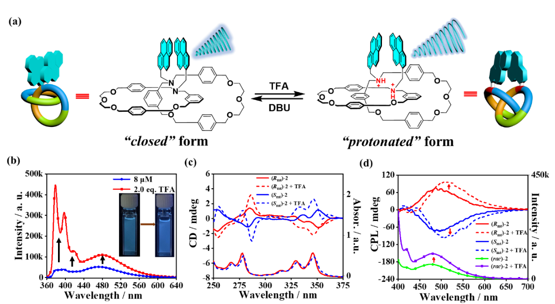 4. a)拓扑手性[2]索烃的可逆共构象转化示意图;(b)加入TFA刺激前后的荧光光谱;(c)加入TFA刺激前后的紫外吸收光谱和圆二色光谱;(d)加入TFA刺激前后的圆偏振发光光谱。图片来源:Angew. Chem. Int. Ed.