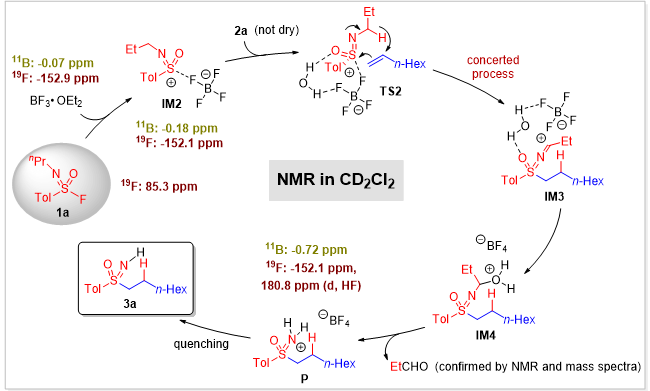 为了清晰描绘反应机理,作者开展了系列机制探究:氘代实验,表明反应过程涉及分子间氢迁移,且其过程可能是反应决速步;对照实验,发现氮α位存在供电子基团(如甲基)时,有利于氢迁移发生;硼谱与氟谱跟踪,发现三氟化硼加入氟代砜亚胺后11B和19F核磁发生了显著变化,印证三氟化硼对氟代砜亚胺活化启动了反应,再释放出亲电活性更高的砜亚胺阳离子。基于非共价相互作用(NCI)分析,三氟化硼的B对氟代砜亚胺的F具有强吸引力(B与F的距离从2.21 Å缩小至1.97 Å),并通过量子化学波函数(Multiwfn)观察到其氟化物LUMO轨道的分布从芳环扩展到硫原子,从而促进与烯烃HOMO轨道的有效重叠。DFT计算清晰表明反应是通过协同船式六元环过渡态(能垒为15.4 kcal/mol),而不是分步碳正离子过程(能垒为23.1 kcal/mol)。值得一提的是,体系中微量水的氢键作用既可促进S-C键构建,又可促进后续亚胺水解。