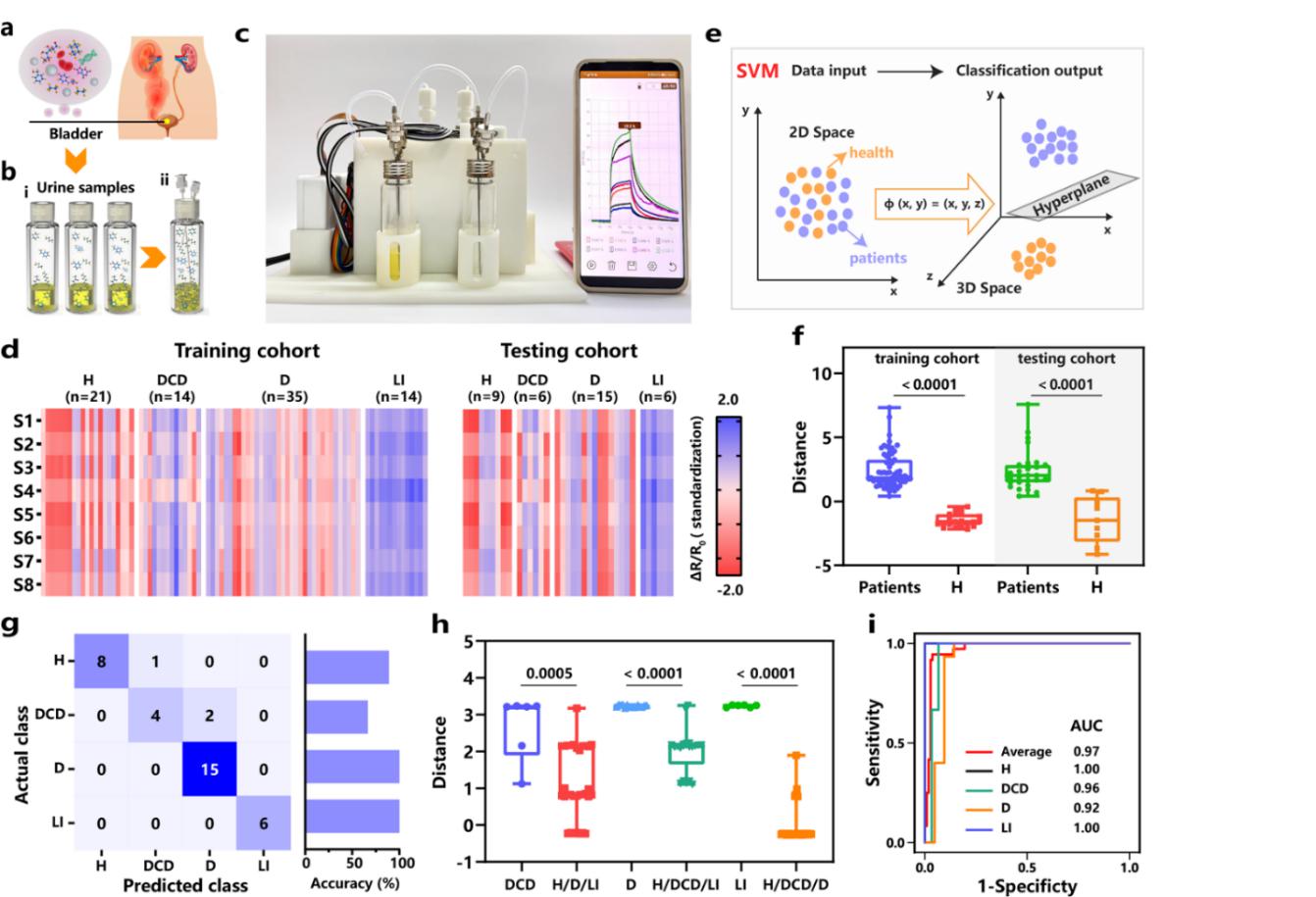 4. (abc)尿液样本收集、鼓泡、配置智能手机的便携式POCT平台;(d) MHMF电子鼻(标准化)热图;(e) 健康和患者分类的SVM算法示意图;(f) 训练组和测试组中患者与H比较的支持向量机的距离值的箱型图;(g) 支持向量机分类结果HDCDDLI的混淆矩阵;(h) 支持向量机分析得出的HDCDDLI在检验队列中比较的距离值的箱线图;(i) 支持向量机算法分类HDCDDLIROC曲线。注:健康组(H)、糖尿病组(D)、糖尿病共病抑郁(DCD)、肝损伤(LI)。