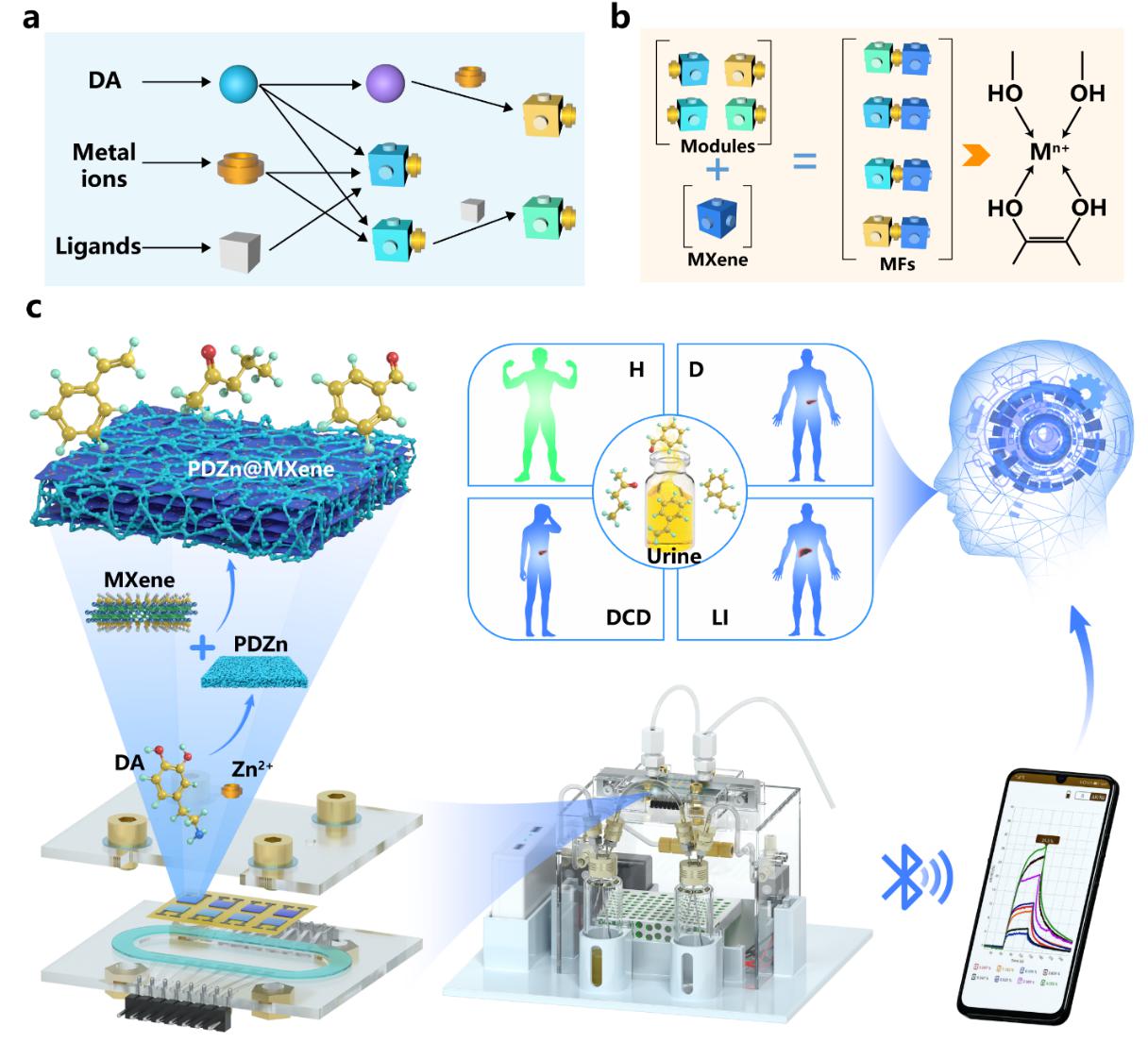 1:基于配位驱动组装分层多孔MXene框架(MFs)气敏材料构建尿液VOC即时检测平台示意图