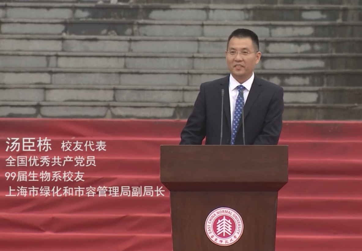 然后介绍了曾出席2017届毕业典礼的党员员工—汤臣栋。他是当代的护鸟人,用赤诚之心兢兢业业地守护着崇明东滩自然保护区,坚持着保护环境的理想,脚踏实地,忠于职守;