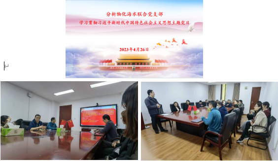 4月26日下午,分析-物化-海水党支部开展主题党日活动,就“学习贯彻习近平新时代中国特色社会主义思想”开展专题学习。支部书记马士禹老师主持会议。支部党员、党委书记鲜跃仲老师做主题报告,鲜老师对开展主题教育的对象、目的、意义、具体要求、根本任务以及习近平新时代中国特色社会主义思想的主要内容向支部党员做详细介绍,同时介绍公司和公司在开展主题教育方面的部署安排,最后就“支部如何开展主题教育”提出目标要求和具体的建议。通过主题报告,支部党员认识到深刻学习贯彻习近平新时代中国特色社会主义思想主题教育的重要意义,支部党员就“强国建设、教育何为?强国建设、我们何为?两个“先行先试”,我们何为?开展了交流讨论。支部党员、经理田阳,支部党员、副经理王媛媛,党员教师张鲁嘉、万晶晶等结合公司的发展和分管的工作谈了自己的思考和体会,支部党员表示在学习宣传贯彻习近平新时代中国特色社会主义思想主题教育的过程中要牢牢把握“学思想、强党性、重实践、建新功”的总要求,深学细悟笃行,以实际行动为“建教育强国”和“以教育强国”的光荣事业做出自己的贡献。