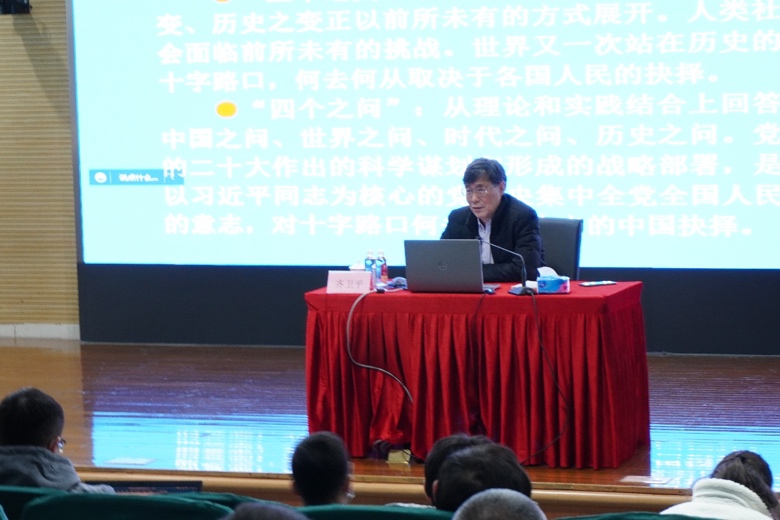齐卫平教授以“奋斗新时代新征程的思想指南和行动纲领——认真学习领会党的二十大精神”为题,从“深刻认识党的二十大召开的重大意义”“加深理解党的二十大主题”“认真学习党的二十大报告主要内容”“奋力谱写更加绚丽的华章”等四部分,全面深入地阐释和讲解党的二十大报告。