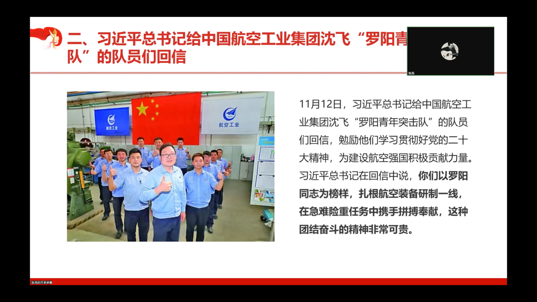 随后,张老师带领大家学习习近平总书记给中国航空工业集团沈飞“罗阳青年突击队”队员们的重要回信精神,11月12日,习近平总书记给中国航空工业集团沈飞“罗阳青年突击队”的队员们回信,勉励他们学习贯彻好党的二十大精神,为建设航空强国积极贡献力量。结合习近平总书记重要回信内容,支部全体党员深入学习领会习近平总书记对青年工作的一系列重要指示批示精神,深入学习贯彻习近平总书记关于教育的重要论述,全面贯彻党的二十大精神,踔厉奋发、勇毅前行,为全面建设社会主义现代化国家作出新贡献。