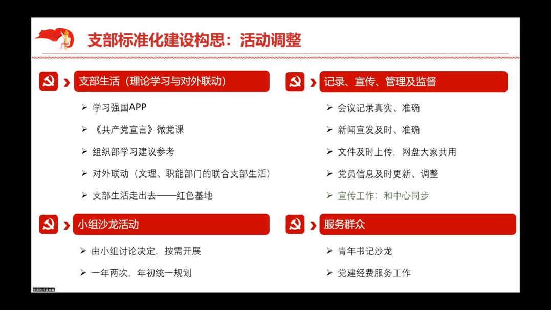 理论和精神学习结束后,党日活动进入研讨阶段,张老师提出支部标准化建设构思:以党建促发展,建设创新型党支部,主要从围绕“理念创新”、依托“制度创新”和立足“业务创新”三部分展开。首先,张老师对党支部成员的分组进行了调整,根据支部党员的工作岗位和实际需求差异重新划分党小组,四位支委分别担任党小组组长,根据党小组党员的实际需求策划组织党小组活动。其次,张老师对2023年支部党日活动安排进行规划,针对支部生活、党小组沙龙活动、支部生活记录宣传、党员日常管理和监督等方面,从“基础理论学习”“教学能力提升”和“业务能力提升”三个层面详细策划了未来一年的支部活动,号召支部党员围绕岗位特色,主动讲出诉求,集思广益、共促发展。