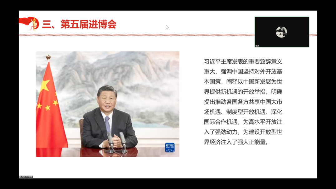 接下来,张老师带领与会党员一起学习习近平总书记在第五届中国国际进口博览会开幕式上的重要致辞精神,勉励大家以新时代师大人的智慧和力量,持续为上海高水平对外开放和加快推进城市现代化提供有力支撑。