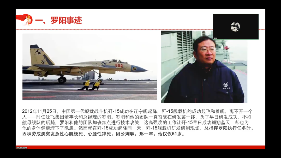 会议伊始,张亮带领与会党员重温罗阳事迹。2022年是全国优秀共产党员、航空工业英模、原航空工业沈飞董事长、总经理罗阳同志逝世十周年,是习近平总书记对学习罗阳优秀品质和可贵精神作出重要批示十周年。罗阳同志的一生,是对党忠诚、航空报国的一生,他将毕生的精力和智慧全部奉献给了党和人民的航空事业。张老师指出,一方面大家要学习敬业奉献的精神,在自己的工作岗位上尽职尽责;另一方面要关注自身健康,平衡好工作和生活。
